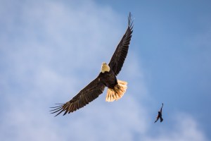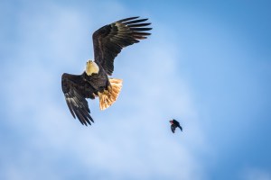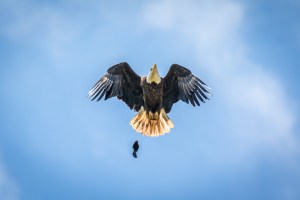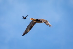 A couple of weeks ago, I witness an amazing ballet (battle?) in the sky over Grand Pre, Nova Scotia. A bald eagle was being harassed by a redwing blackbird, presumably because he had a nest nearby. At one point the little fellow even plucked a downy feather from the eagle’s rump! It’s challenging photographing birds overhead with a heavy zoom lens, especially when they are dodging and swooping in battle. I managed to capture a few epic images that I will treasure forever. Enjoy!
