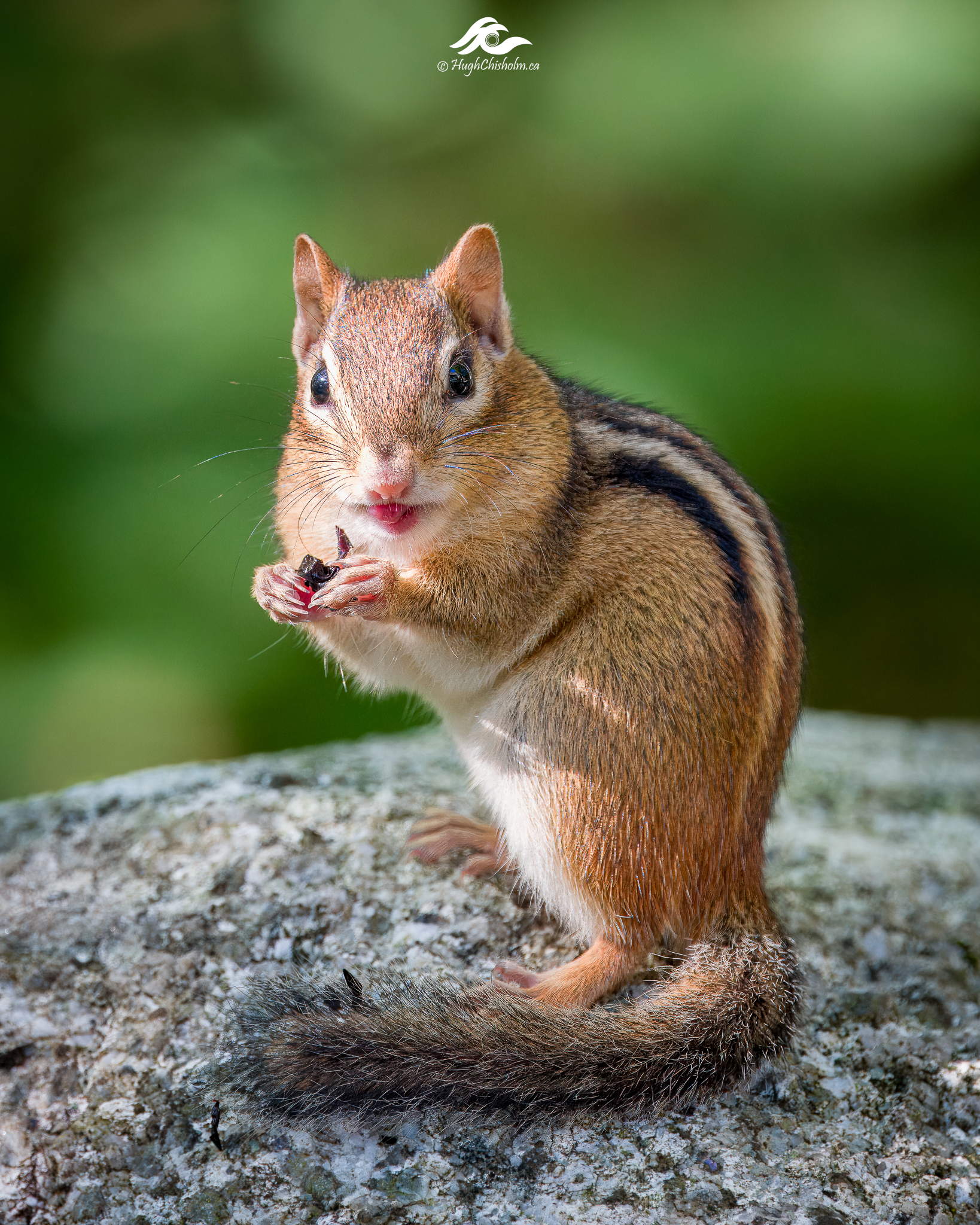 I love it when an animal looks at me while I’m taking their photograph! The eye contact makes for a great connection between the image and the viewer. It’s an added bonus when they stick their tongue out. This little squirt is an Eastern Chipmunk, gnawing on a blueberry.