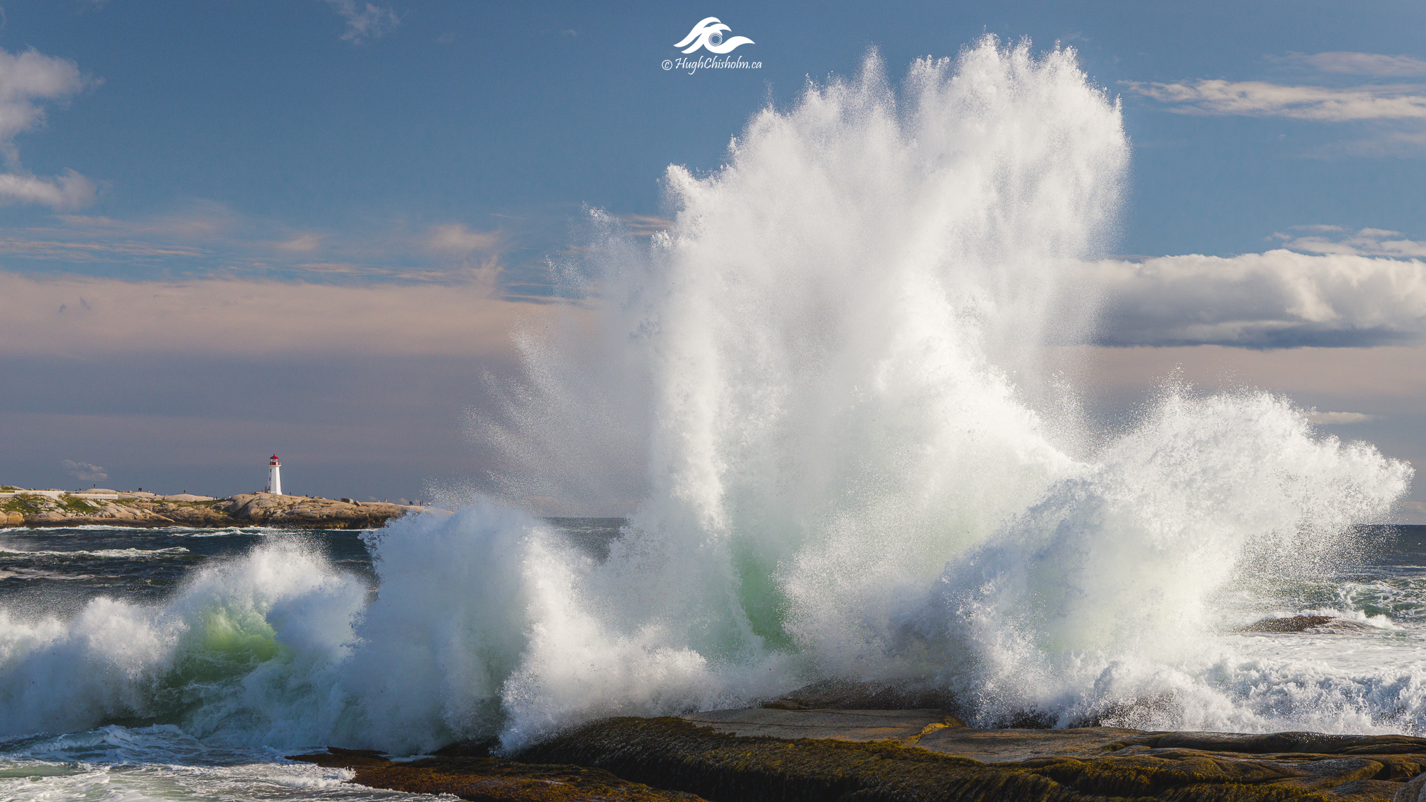 Whenever there’s a hurricane spinning offshore I head for the coast. You can capture some epic wave images as the swells crash on the rocks. That’s the iconic Peggy’s Cove lighthouse in the distance.