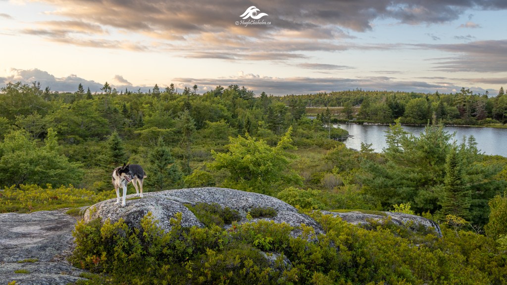 Suzy loves walks in the woods but she hates having her photo taken. I need to wait until she’s distracted, then I can capture her in the scene. Here she’s looking out over Cranberry Lake in Hubley.