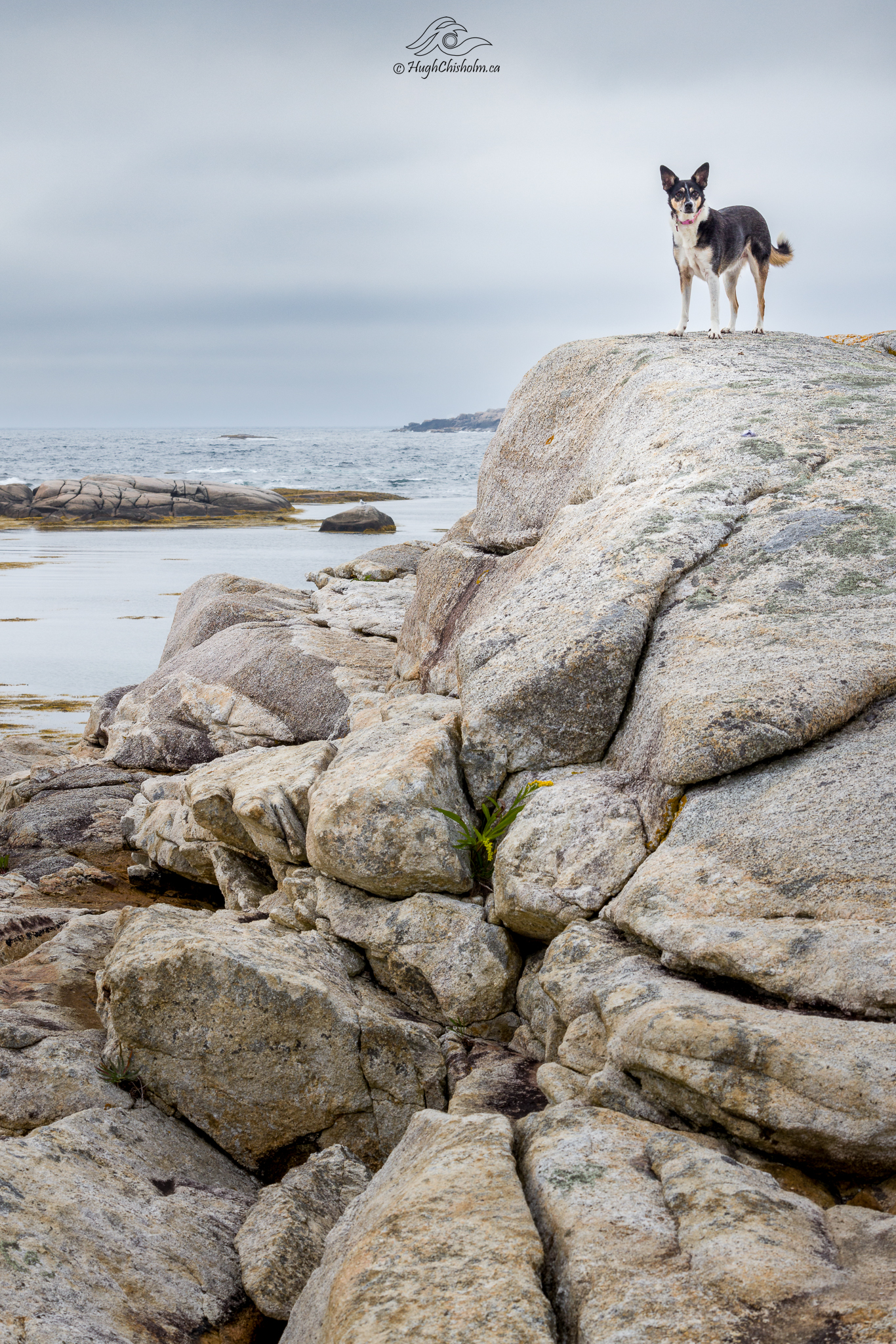 Suzy waiting impatiently for me to catch up. She’s older than me (in dog years) but she’s in much better shape! Taken along the shore at Polly’s Cove.