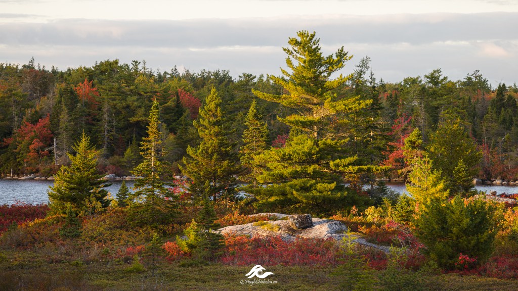 Gorgeous golden hour light on a patch of evergreen trees along the shore of Cranberry Lake in Hubley.