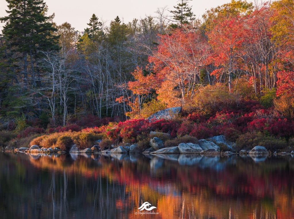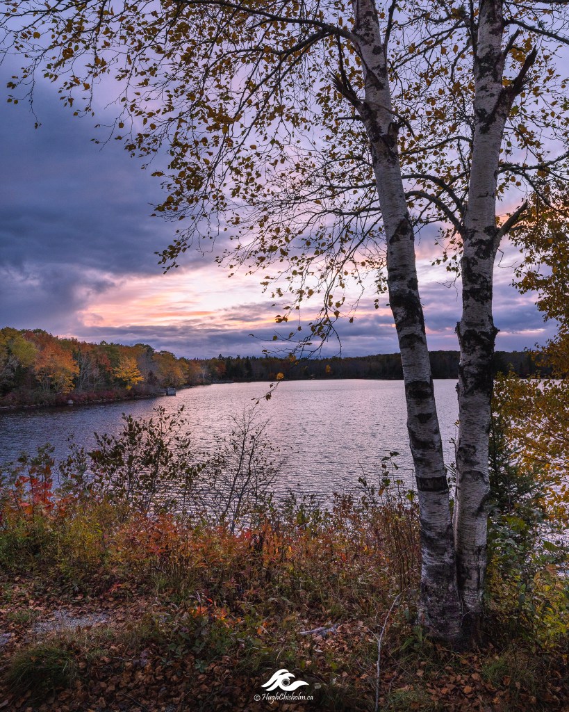 We were walking along a wooded path at Long Lake Provincial Park when my wife Kathy noticed this splash of colour along the shore of Cranberry Pond. It was just a few minutes before sunset so I had to rush down to the shoreline to capture this scene. Everything turned dark and muted shortly after I pressed the shutter.