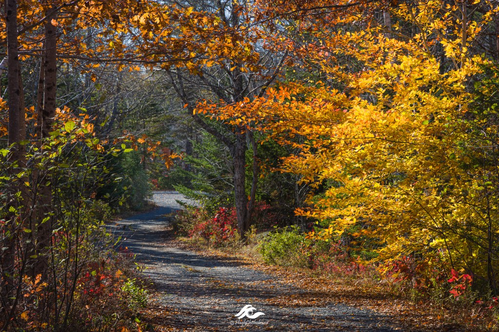 Golden autumn leaves light up the road in Jerry Lawrence Provincial Park, Upper Tantallon.