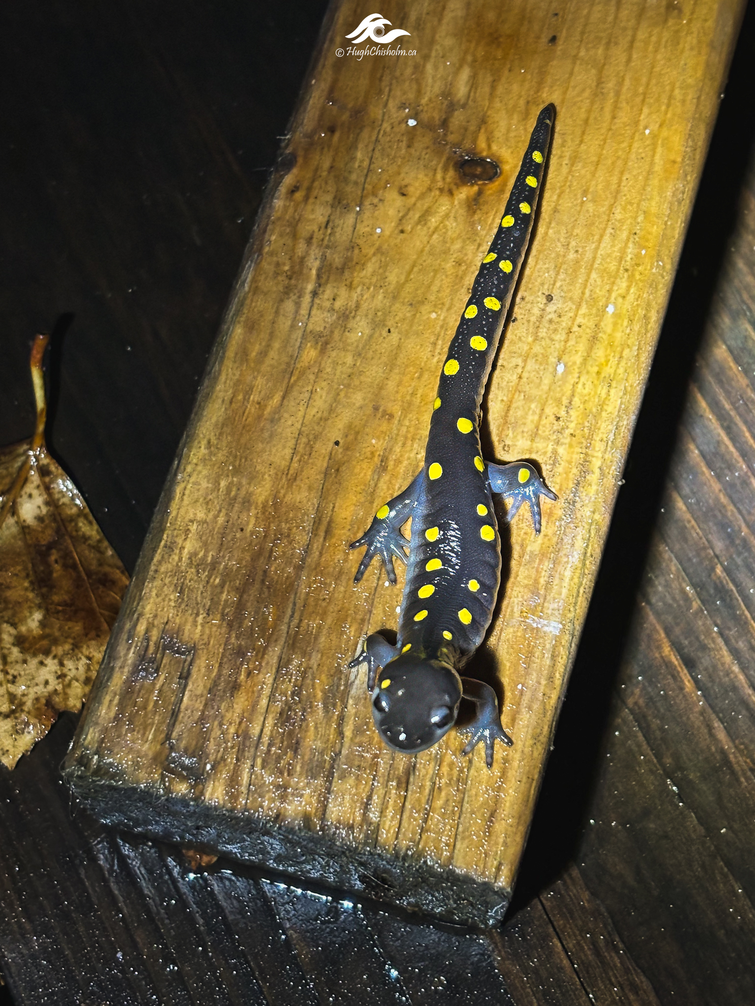 I was out with my dog Suzy as she was doing her business before bedtime when I noticed this spotted salamander perched on a 2′ x 4″ on our deck. I didn’t have my “good” camera with me so I grabbed my iPhone and took a quick shot before he scurried away. I used a flashlight to light him up. Look at those amazing yellow spots!