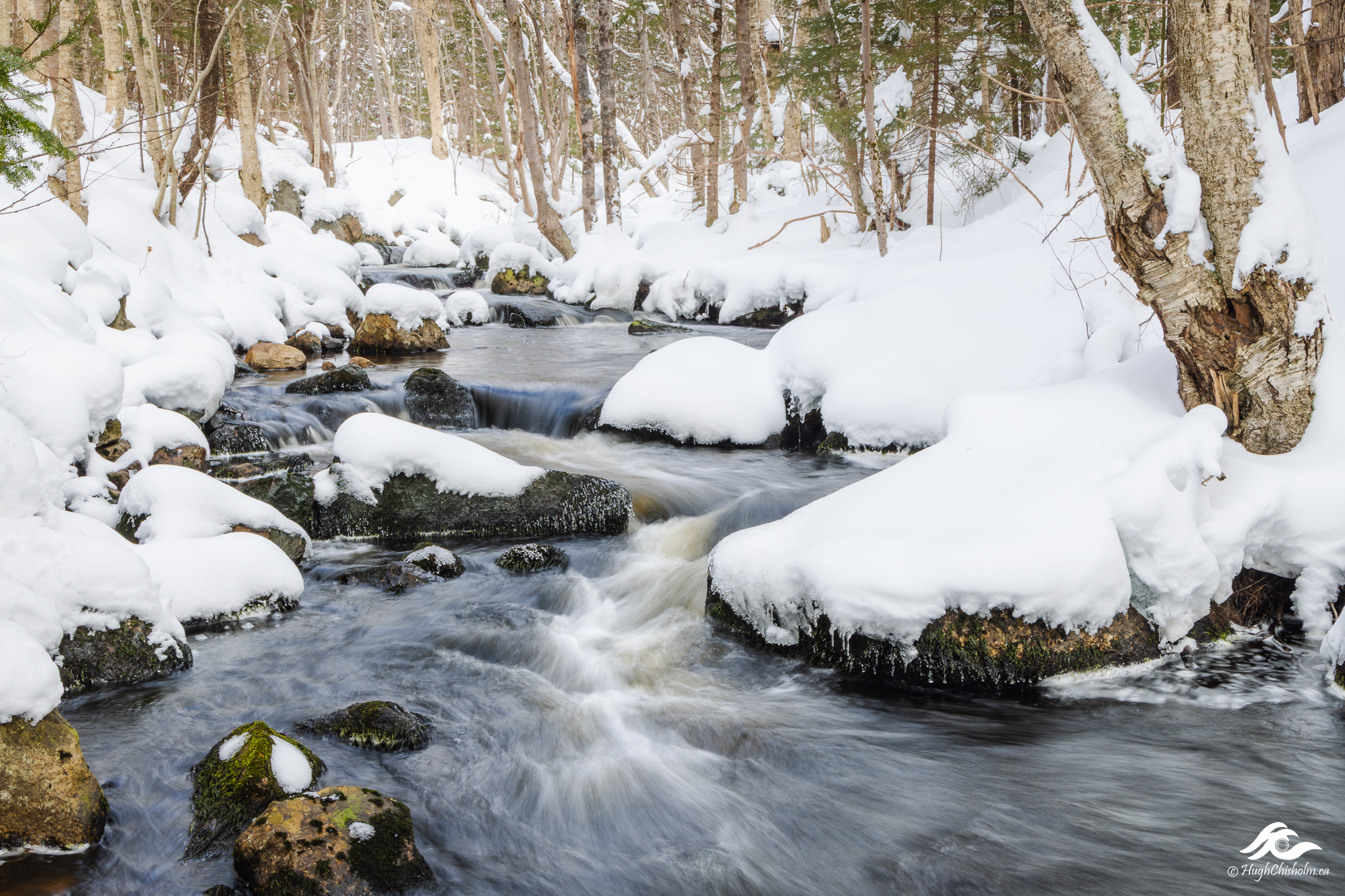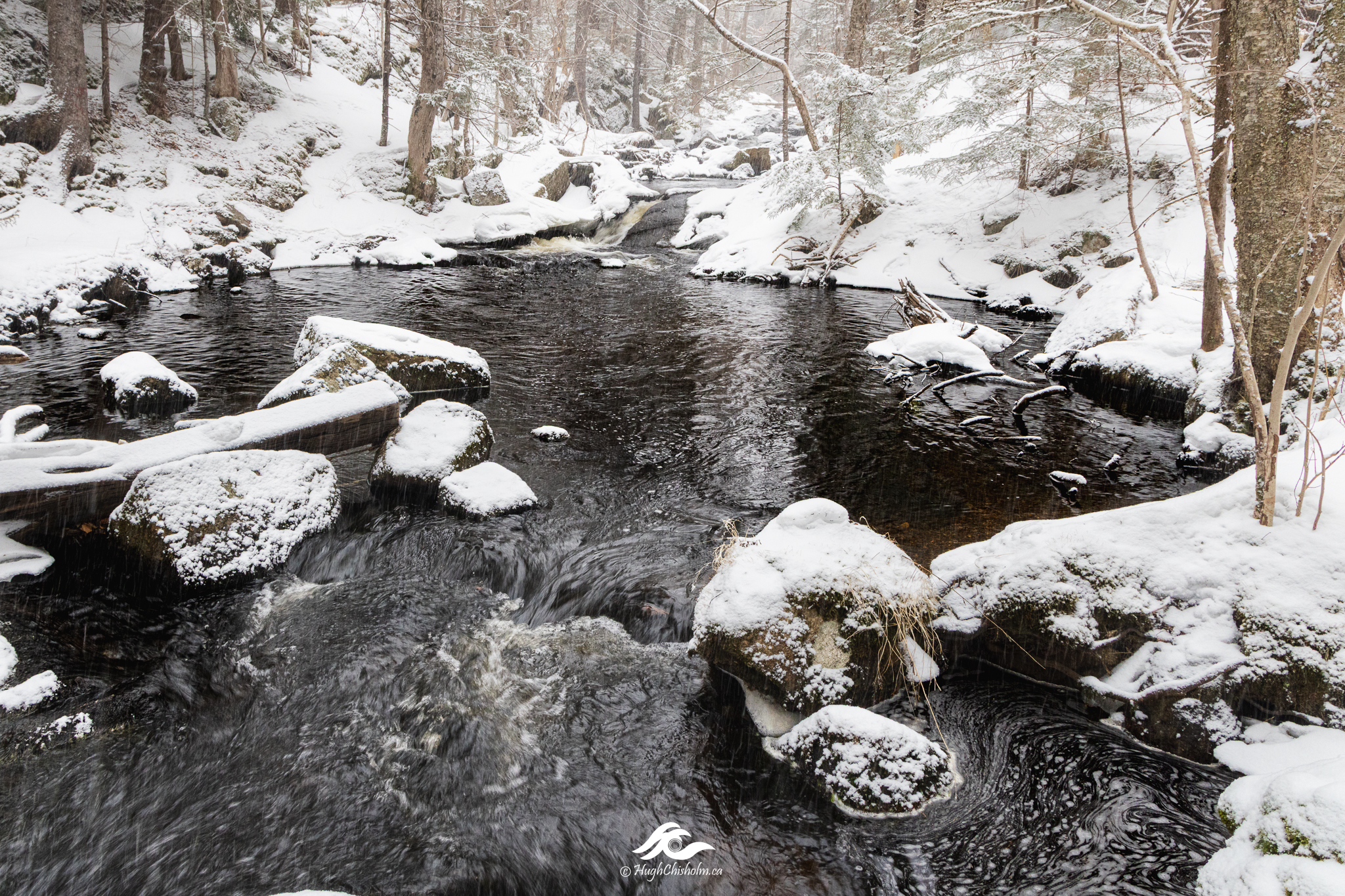 One of my favourite photo locations – a small brook along the rail trail in Fox Hollow, Upper Tantallon. I had to slide down a snowy bank to capture this image not an easy feat for an old guy! I love how the brook meanders through the snow covered boulders!