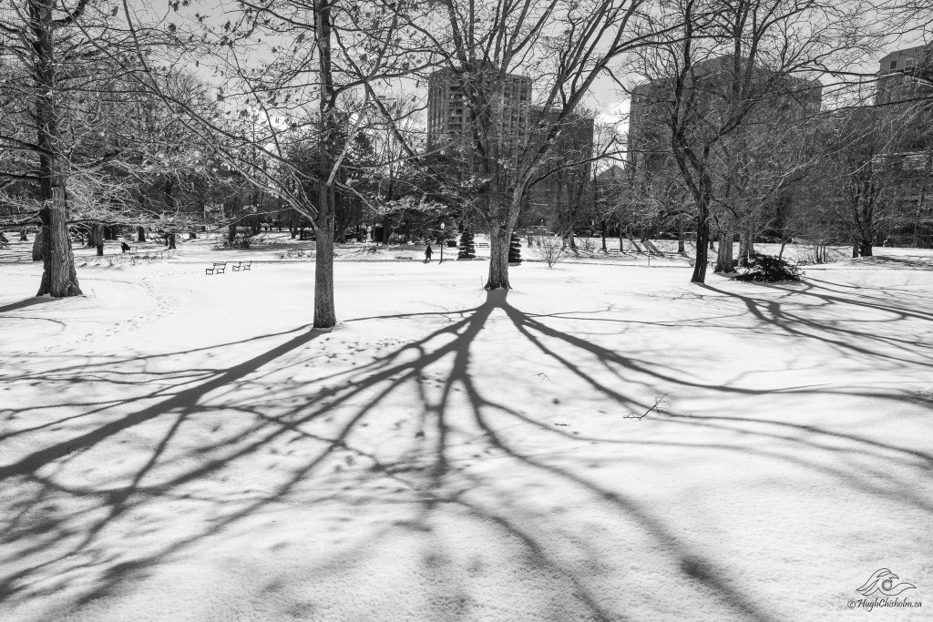 The shadows of the trees created some eye-catching shapes on the fresh snow in Halifax’s Public Gardens. Can you see the person beside the lamp post in the centre of the photo? I had to wait about 5 minutes for someone to reach that spot so I could add them to the story.