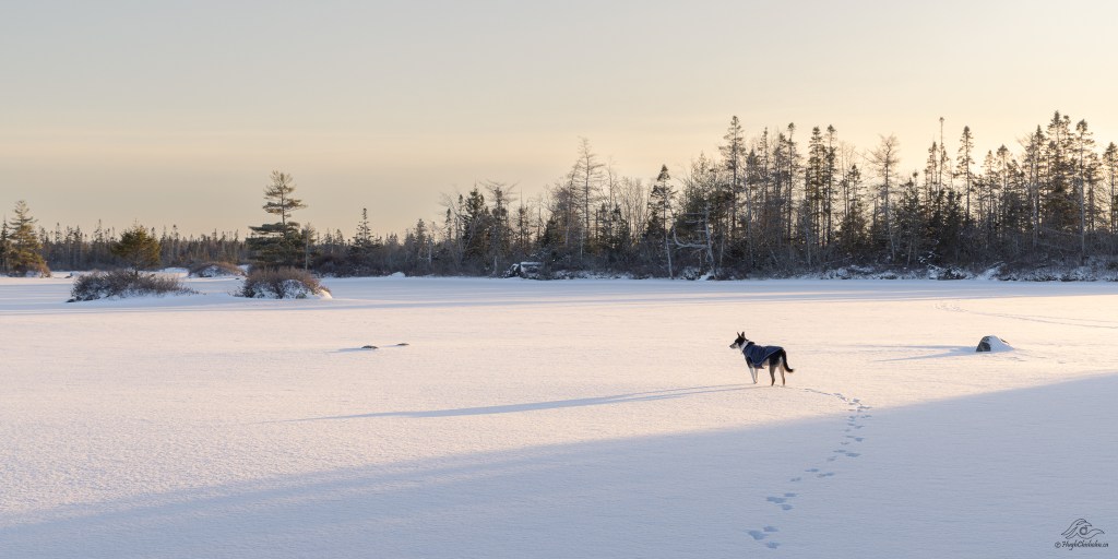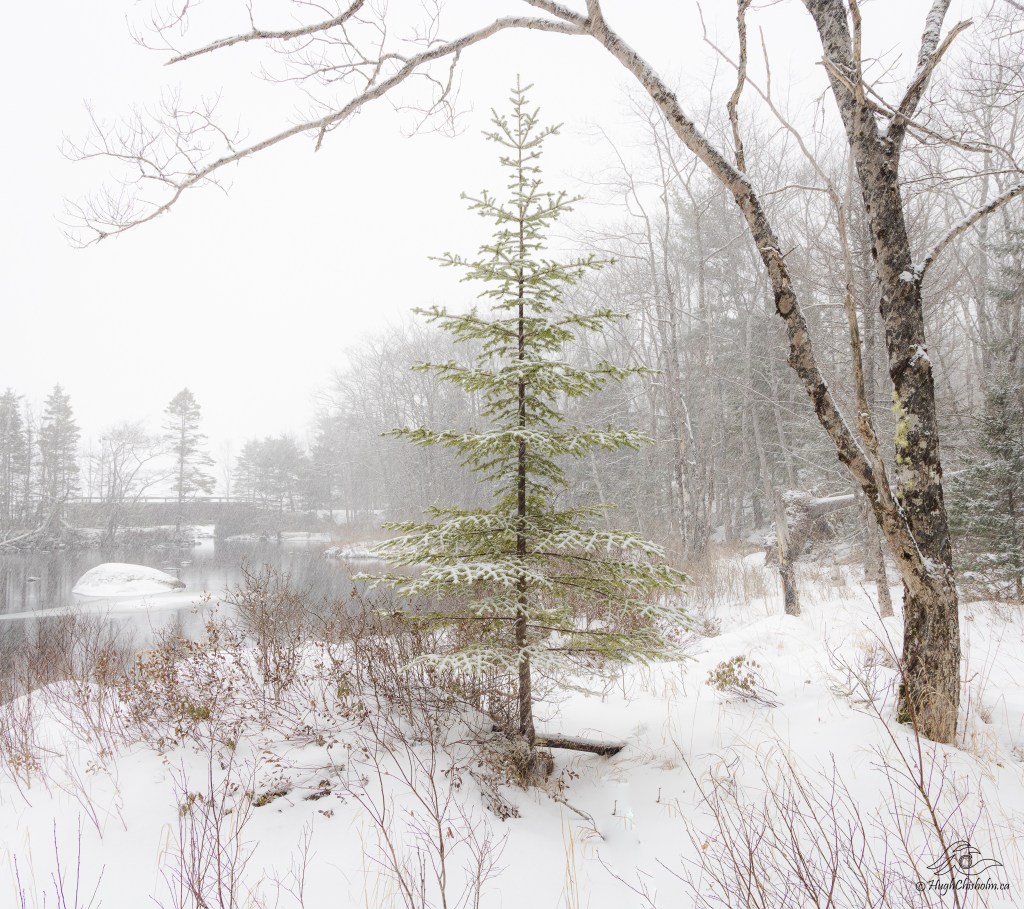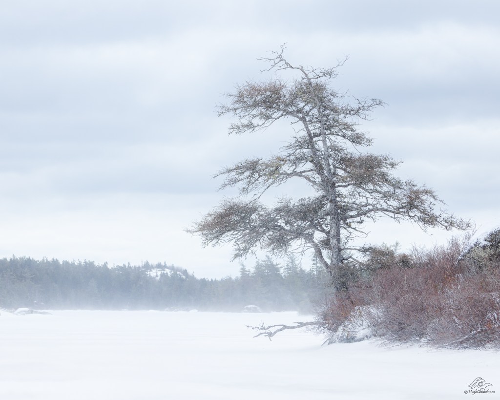 This stately larch/ tamarack is one of my favourite trees to photograph! I usually shoot it from 0.5 km away with my telephoto lens but this year I was able to walk across the frozen lake and shoot it up close. I like how the grey sky and the blowing snow create a nice background that helps it pop! Location: Cranberry Lake, Hubley.