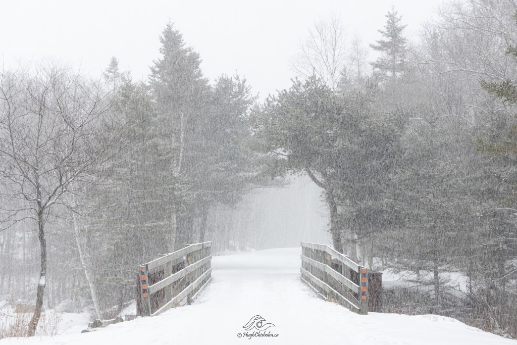 Weather forecasters predicted a few hours of snow followed by a torrential downpour so I grabbed my camera and headed out to get some snow shots before it all washed away. Here are three images from along the rail trail in Fox Hollow, Upper Tantallon. I was the only one out on the trail. As the saying goes, if you want original images you need to go out when others stay at home!