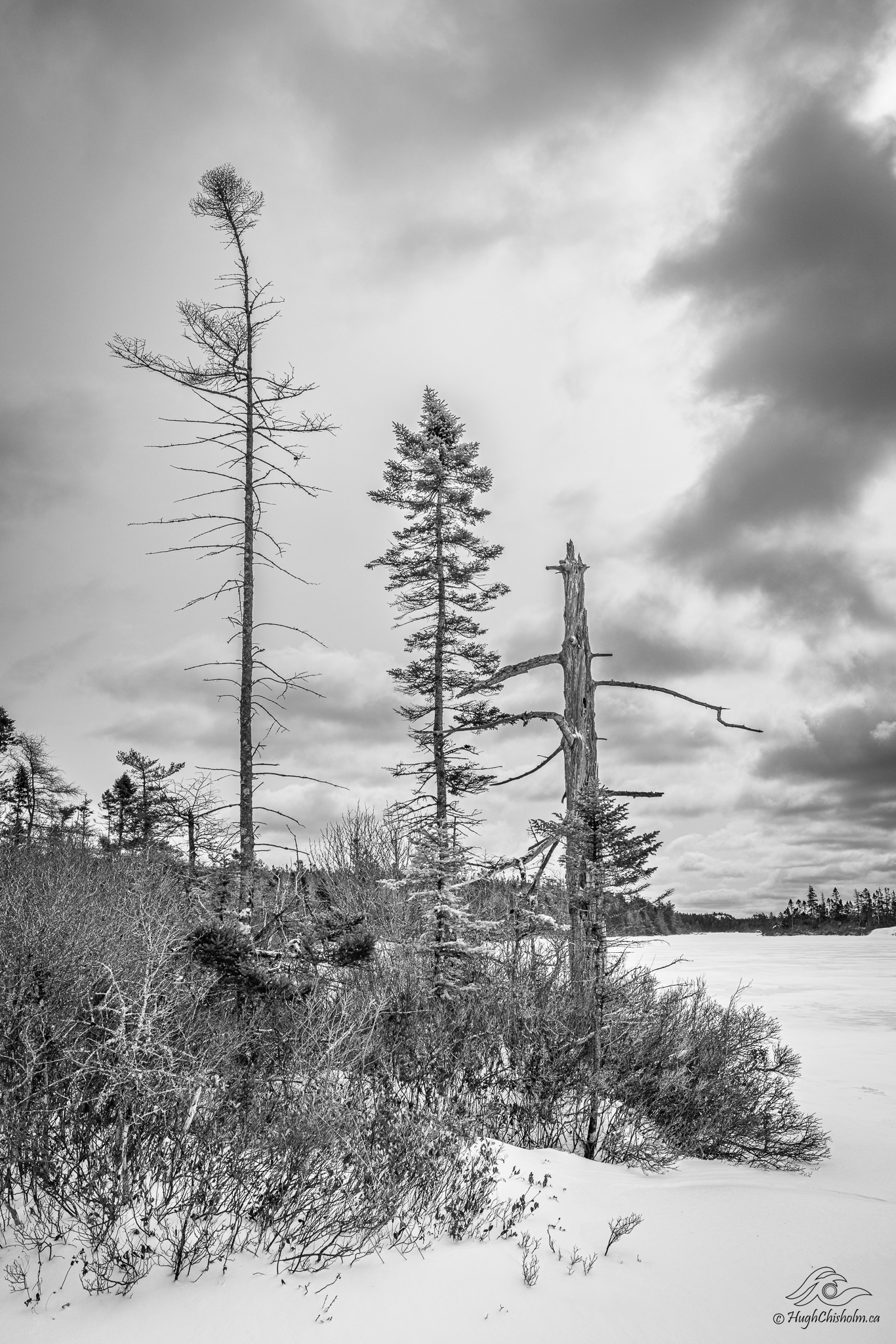 I’m always on the lookout for scenes that I can convert to black and white. This trio of weatherbeaten trees caught my eye as I was hiking along a frozen lake in early March. The cloudy sky adds a nice ominous mood to the scene.