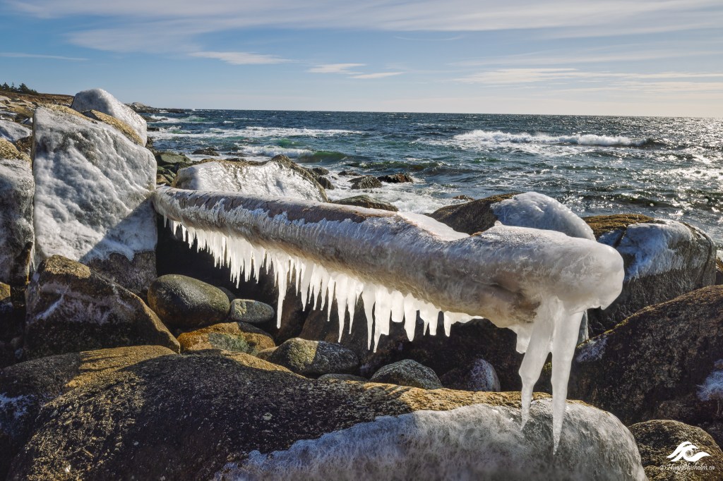 My friend Kevin and I were hiking along the coast when we came upon this pole trapped between the rocks. The spray from the waves had created a row of icicles along the log. I love how they glow in the light of the afternoon sun!