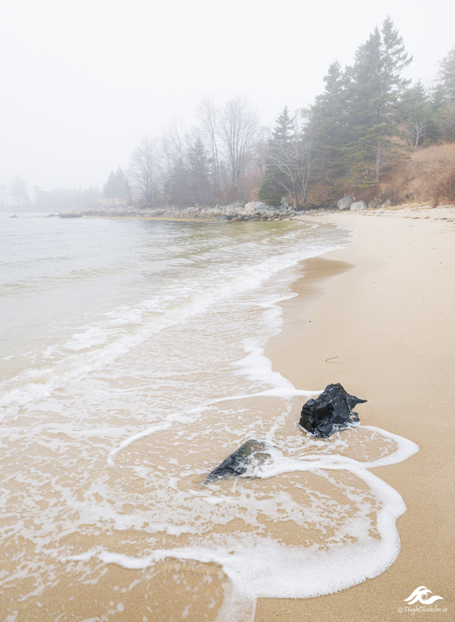 The forecasters were predicting fog so I headed to a small local beach to see if I could capture some moody images. I liked how the waves were wrapping around these rocks so I perched on some nearby boulders to avoid getting wet feet and captured this image.