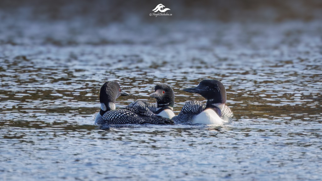 We could hear the loons calling on the lake so I grabbed my camera and a long lens and headed down to the shore in the hopes of capturing a photo. I spotted these three adults travelling together. It’s unusual to see three adults as they typically pair up in the spring. Perhaps it was last year’s offspring saying farewell to mom and dad before heading off to find their own mate.