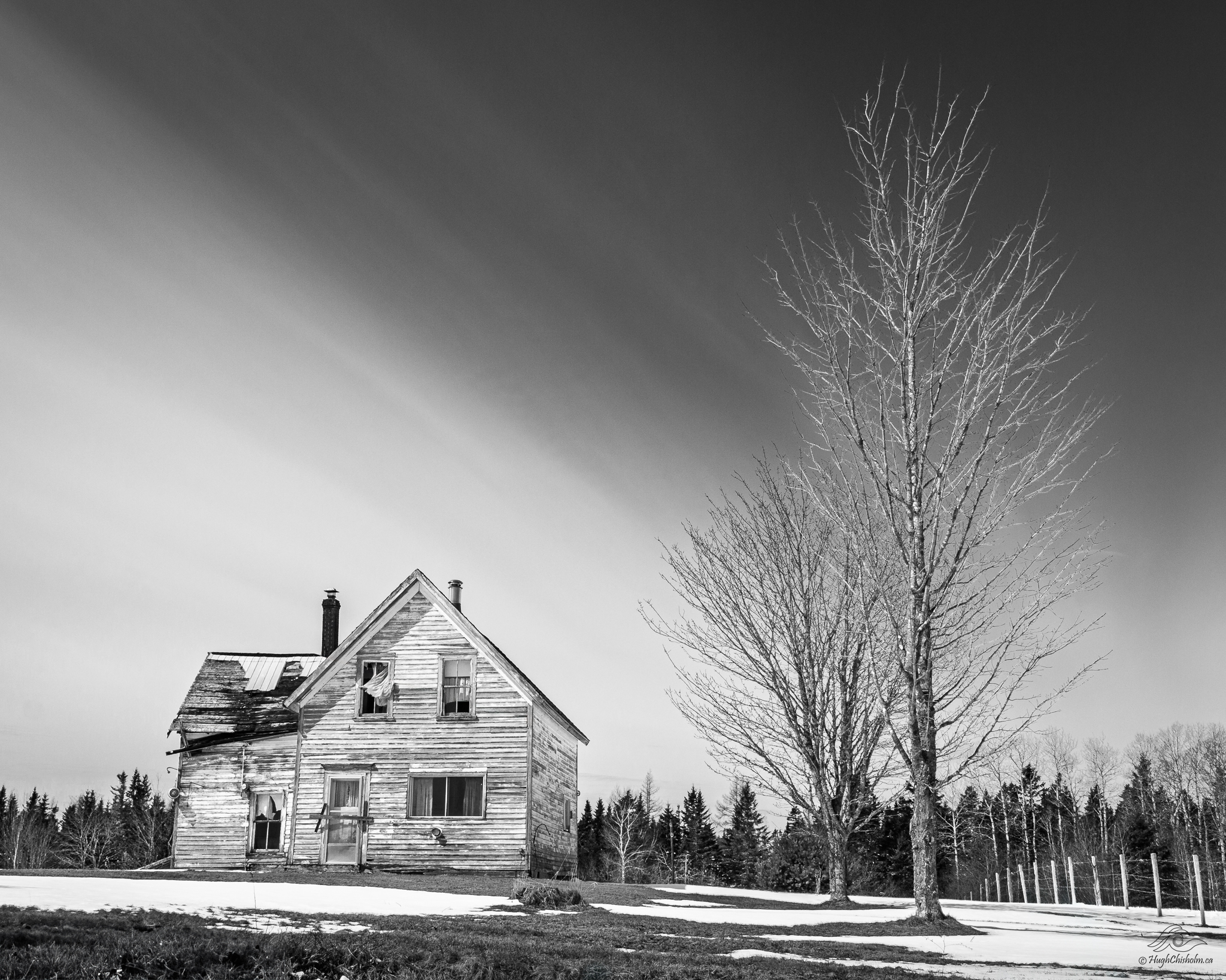I was driving a back country road with my buddy Gordon when we spotted this old house. I really like the contrast between the dilapidated house and the stately trees. The diagonal clouds almost seem to divide the scene between the house and the trees. It’s one of my all time favourite black and white images!