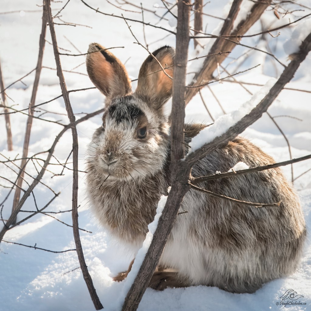 A snowshoe hare dropped by to nibble on our shrubs and wish us a Happy Easter. Look at those ears!