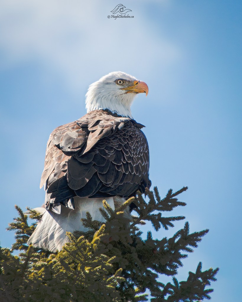 I was driving along our street one day when I spotted this bald eagle perched atop a spruce tree. I grabbed my camera and fired off a few quick shots before he grew tired of me and flew off. Just look at that majestic pose!