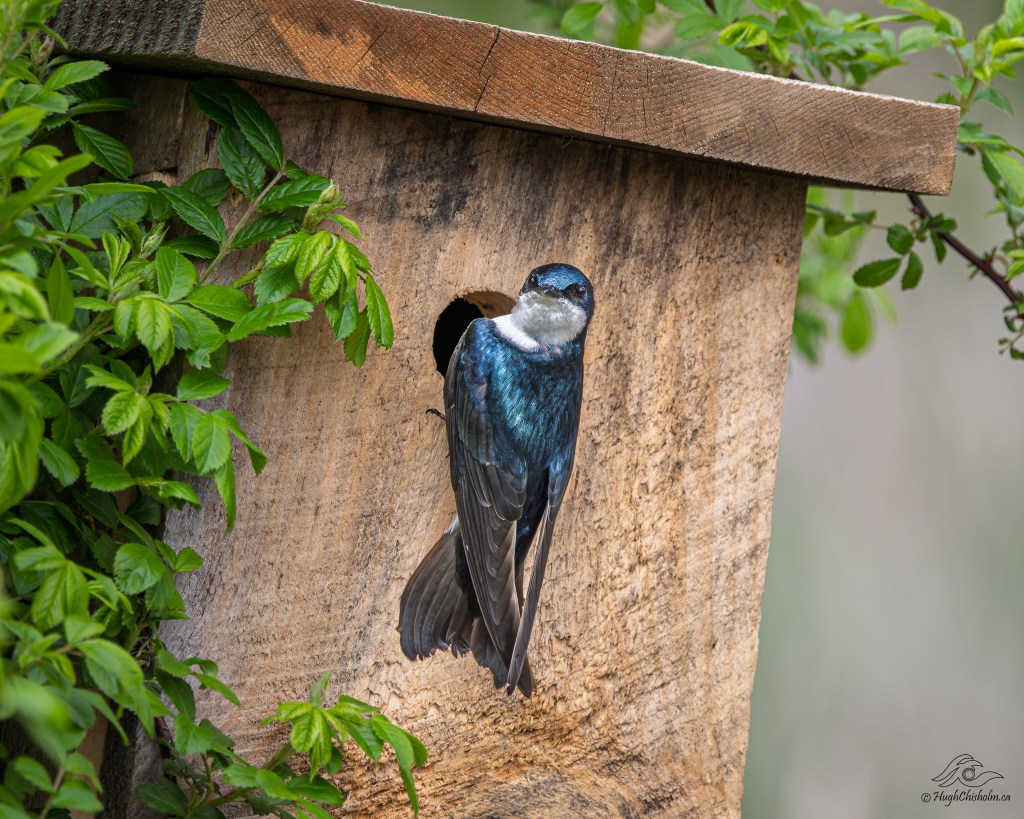 A beautiful iridescent blue tree swallow perched on a nesting box at Miners Marsh in Kentville.