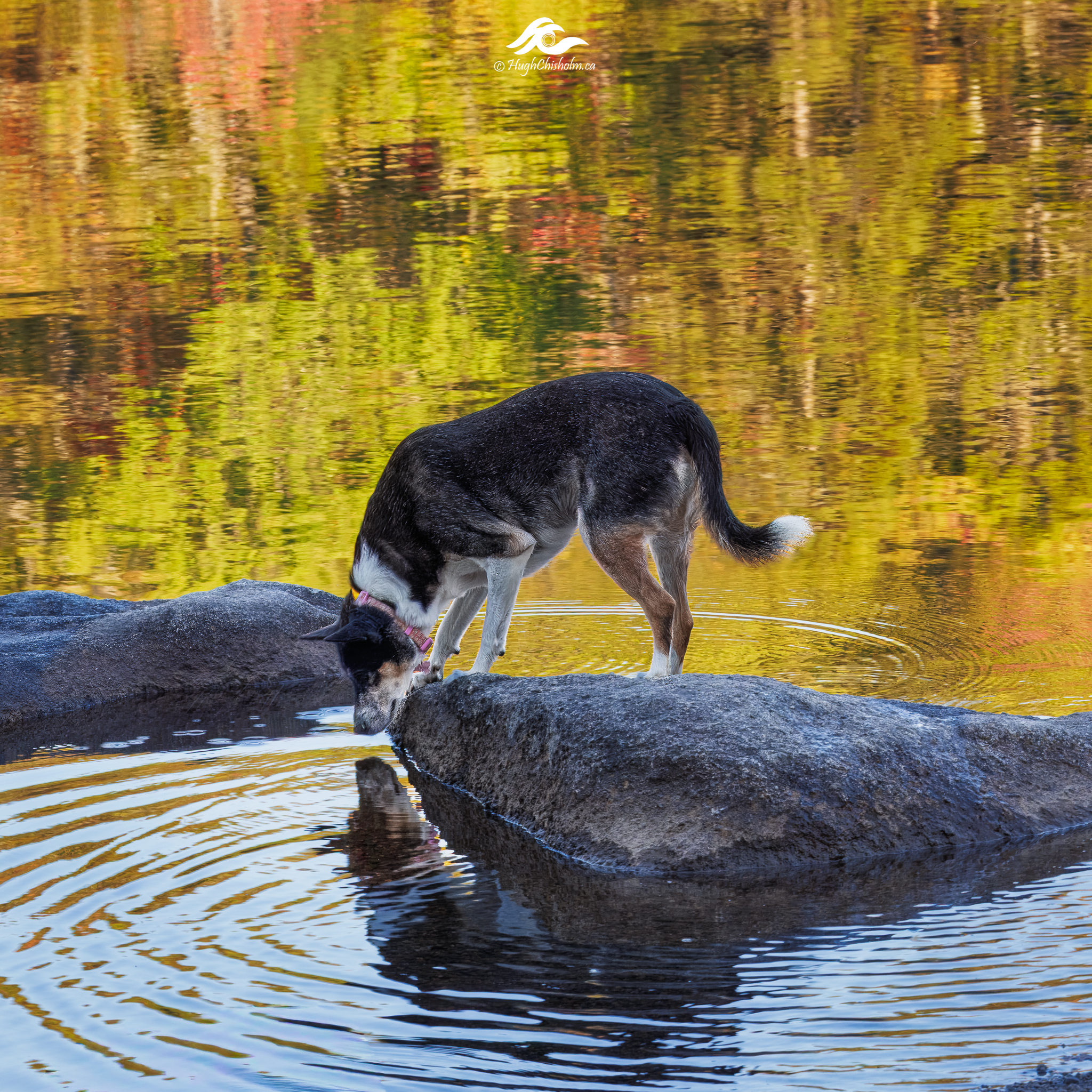 Suzy stopped by the lake to rehydrate and to admire her reflection. One of my favourite photos of our little lady.