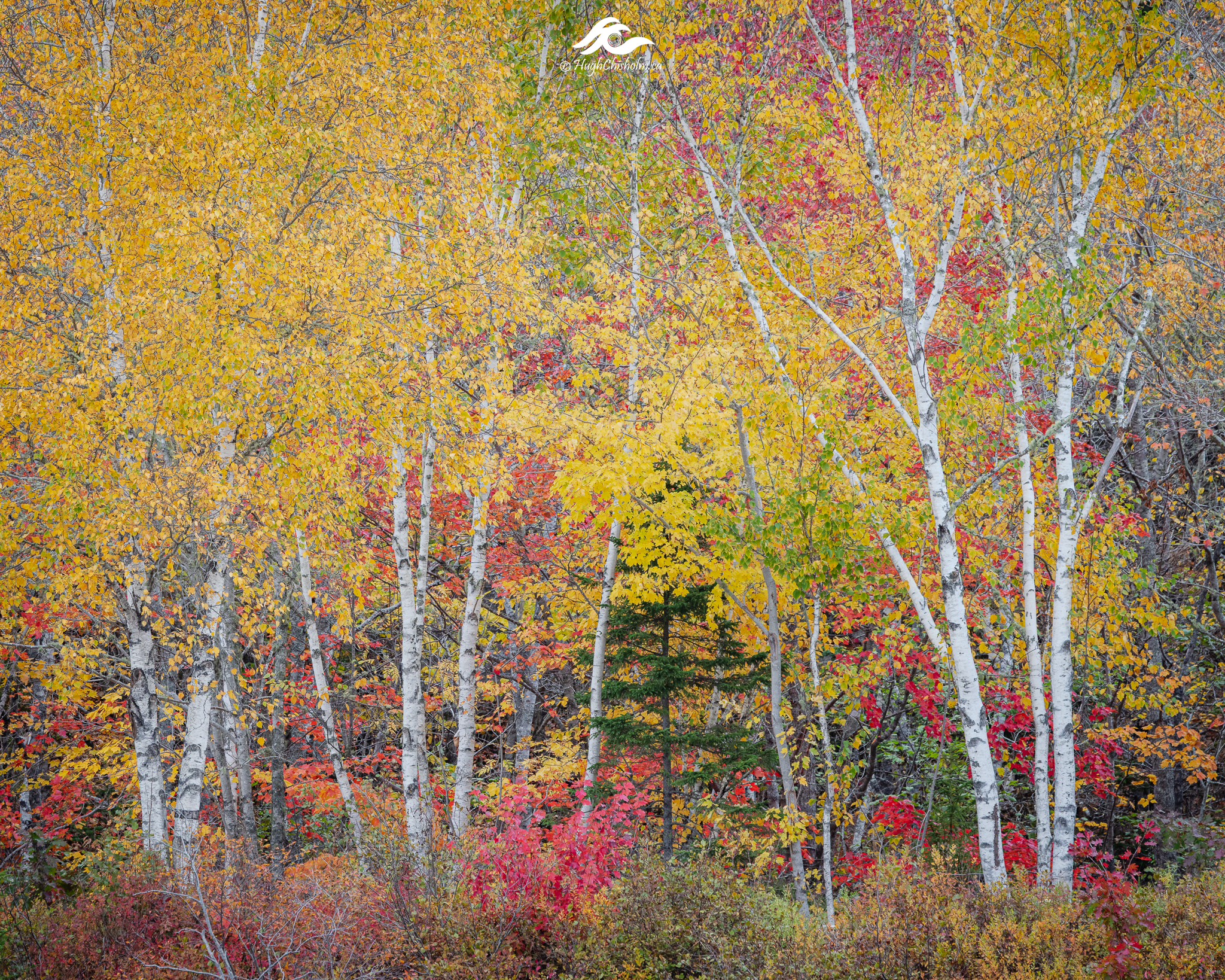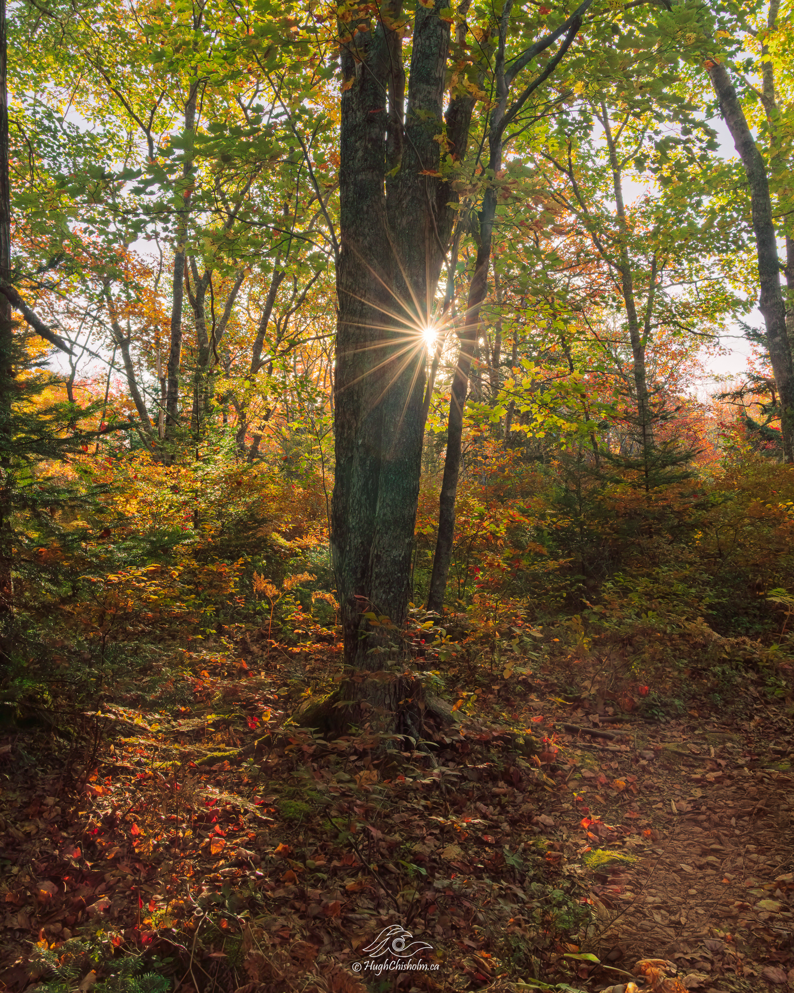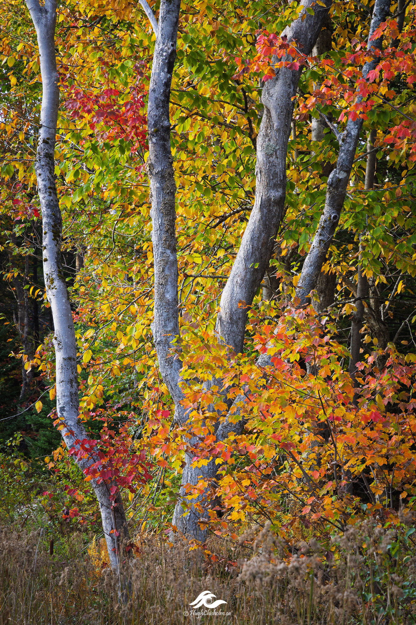 I wanted to capture a zoomed-in view of this colourful scene as the leaves were beginning their transition from green to fall colours. I like how the grey of the tree trunks adds nice contrast to the vibrant colours of the leaves.