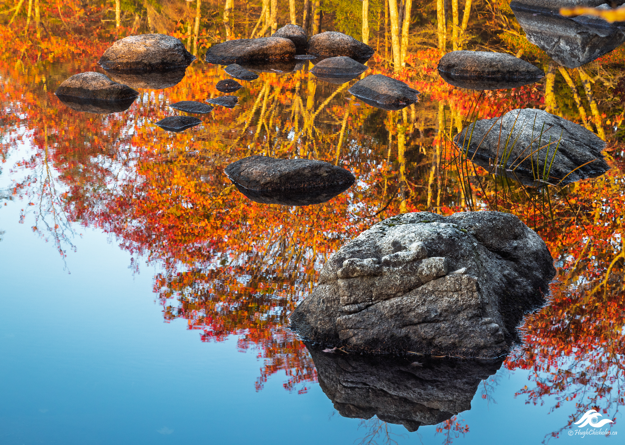 No, it’s not a strange AI image, just a neat view of colourful trees reflected in the calm lake. The dark boulders really stand out against the bright red of the leaves.