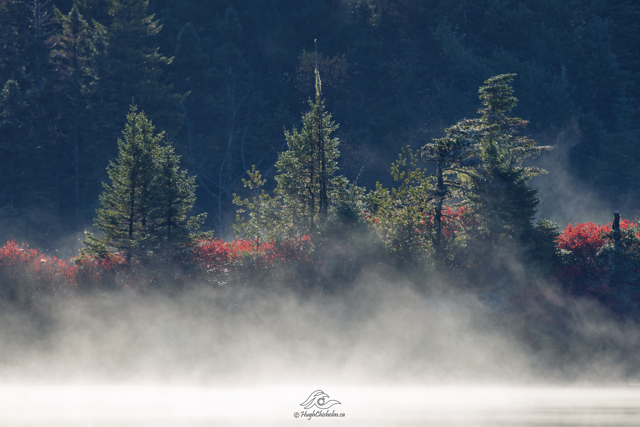 Another cool, misty fall morning. I shot this with a long zoom lens to narrow in on the backlit evergreen trees with the dark forest behind. The red bushes add a nice pop of colour. I just love a backlit scene!