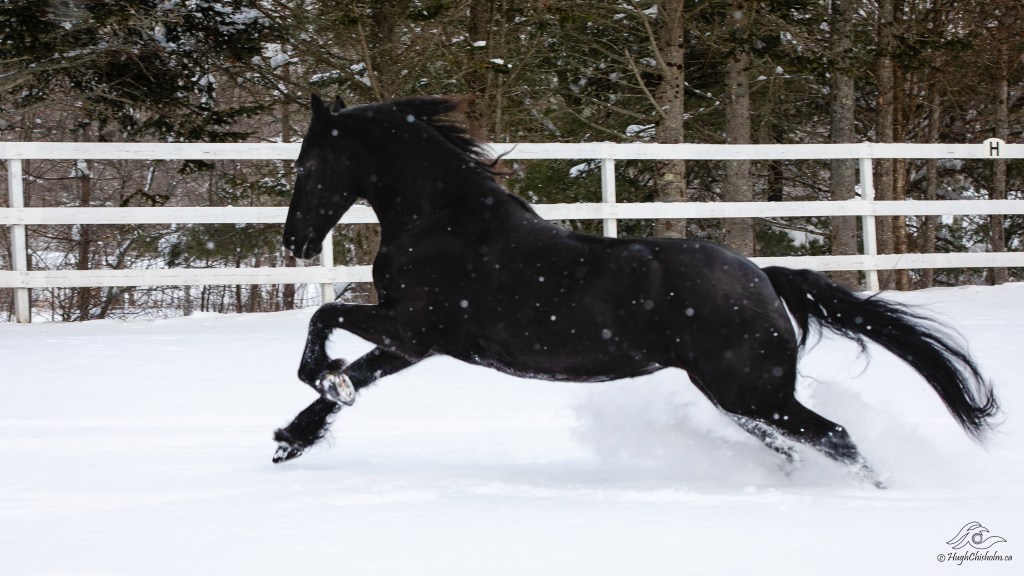 Her name is Layla and she’s a Friesian mare originally from the Netherlands. She loves to frolic in the snow! She was a challenge to photograph on this day as she’s coal black and her surroundings were bright white.