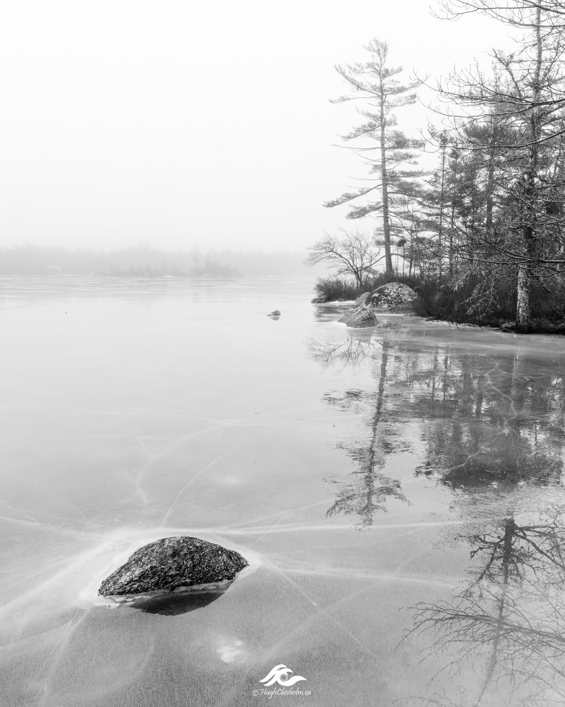 A mild day after a deep freeze made for a great black and white photo shoot at the lake. It was REALLY slippery so I squatted on a rock to capture this scene, otherwise I would have been on my backside in a puddle of icy water.