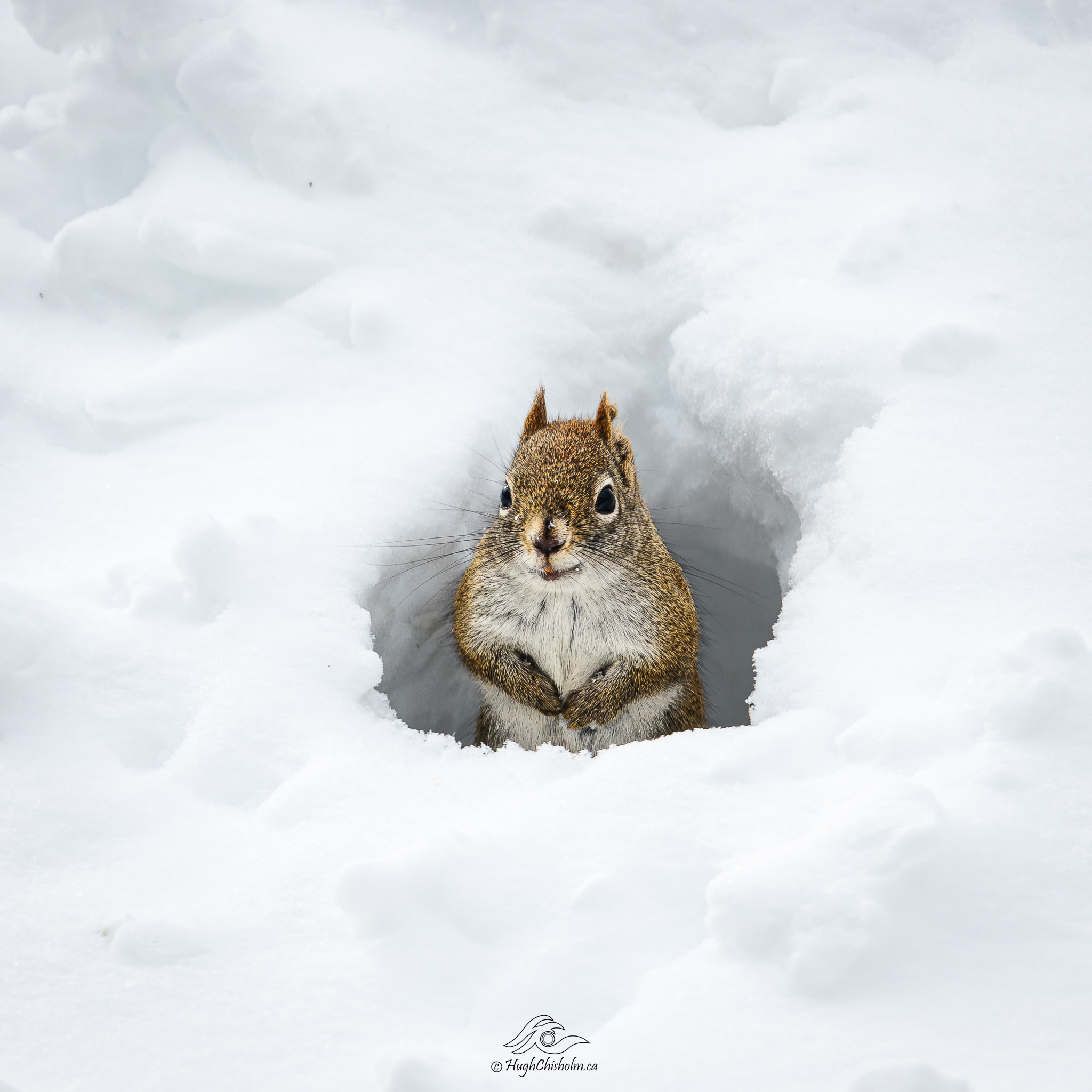 This enterprising red squirrel tunnelled through the snow to a strategic location right under the bird feeder. He looks quite pleased with himself, doesn’t he?