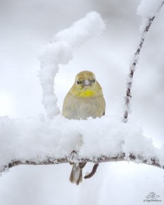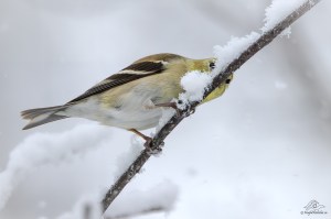 A flock of goldfinches descended upon our bird feeder during an early spring snowstorm. I managed to capture a couple of cute portrait shots while they were here.