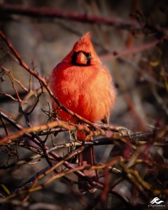 It’s a challenge to capture a good photo of a cardinal as they’re either WAY up in the treetops or hiding among a tangle of branches as they forage for food. This fellow was kind enough to perch on top of a branch for his portrait shot. He let me approach him quite closely before he flew off to join his mate who was hiding in a nearby bush. I moved along so as not to bother them any more while they went about their business.